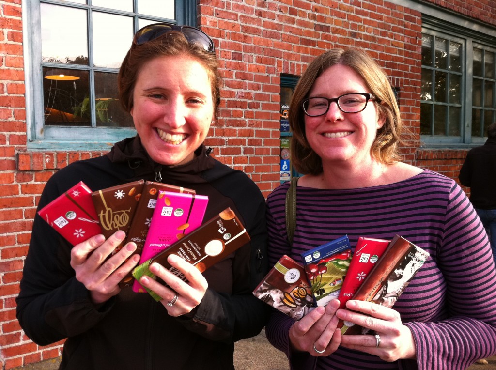 A quick pic with a lot of happiness… Lulu and Sarah stock up at Theo Chocolates in Fremont – a full chocolatier (not just a melter), that’s fair trade and fully organic, and makes some of the best chocolate around.
