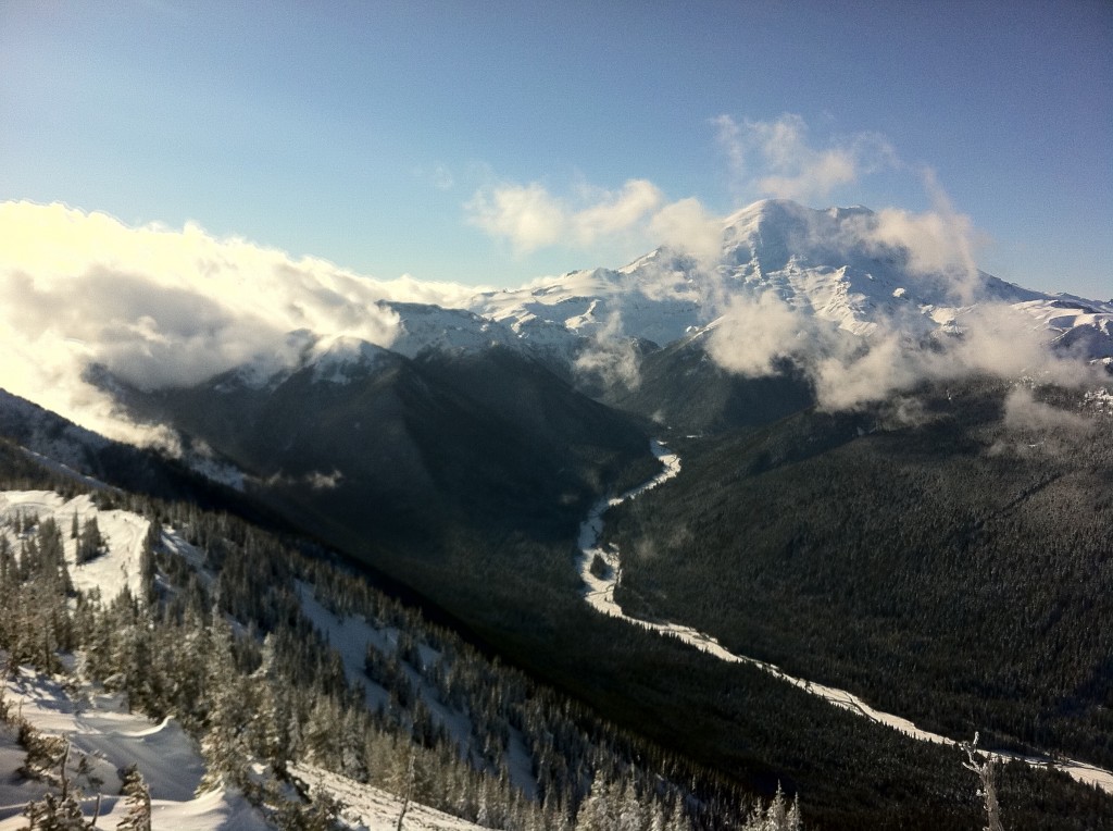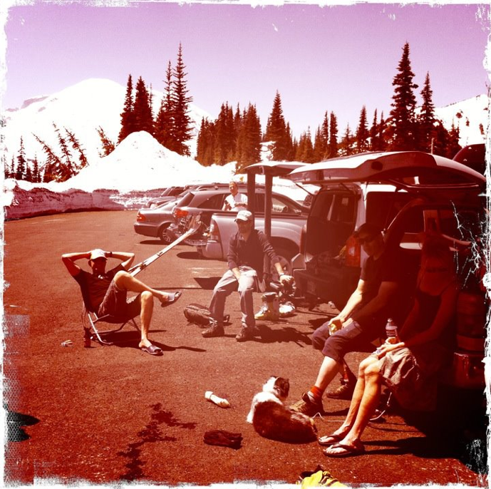 After a successful climb and ski of Mount Hood on Friday, Darrin and I stocked up at the K2 house on a ton of leftovers, breakfast and lunch supplies, water, and hit the road for the Trout Lake USFS Ranger Station. Pulling into the lot around 9:30, we certainly weren’t the only ones thinking about the amazing amount of snow and the excellent weather forecast; at least 5 or 6 other cars pulled up while we went about filling out our own backcountry permits to climb the next day. After setting up a quick camp on the side of the access road, we set an early alarm to repack our bags and hit the trail early.